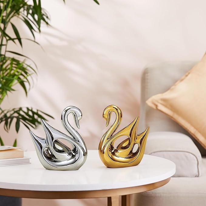 Adorn Golden & Silver Swan Ceramic Figures for Home Decor (Set of 2 Pc, Golden & Silver)